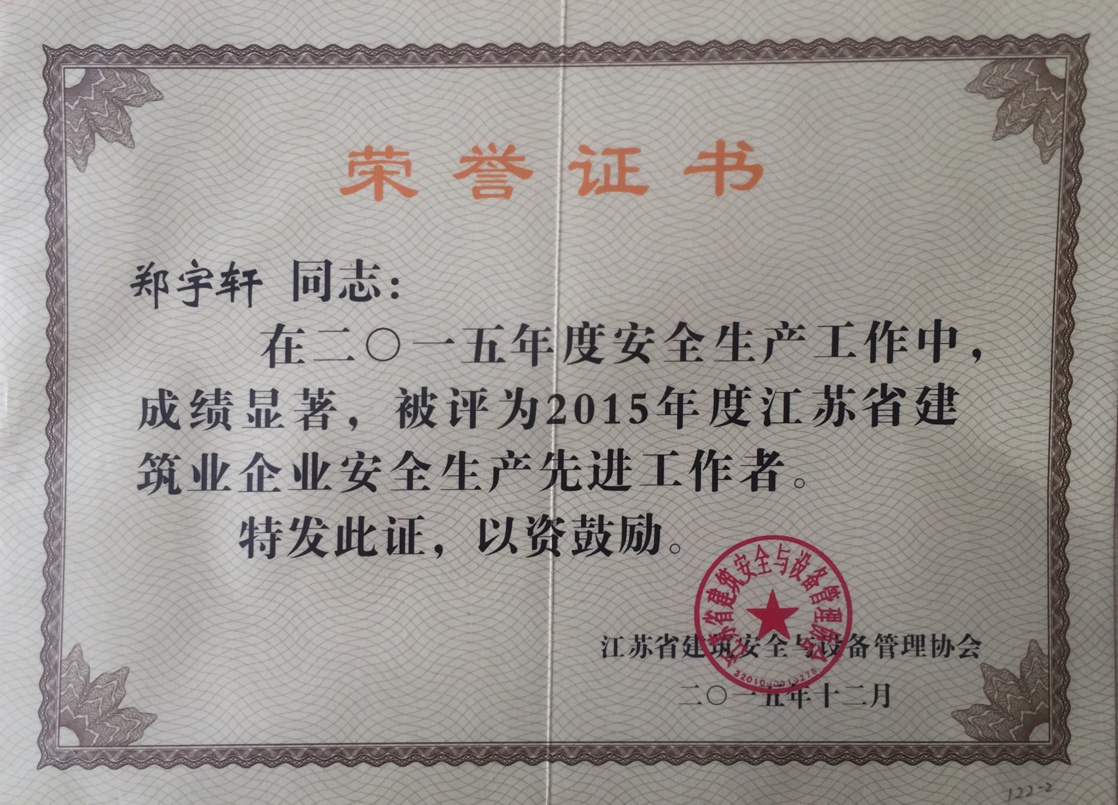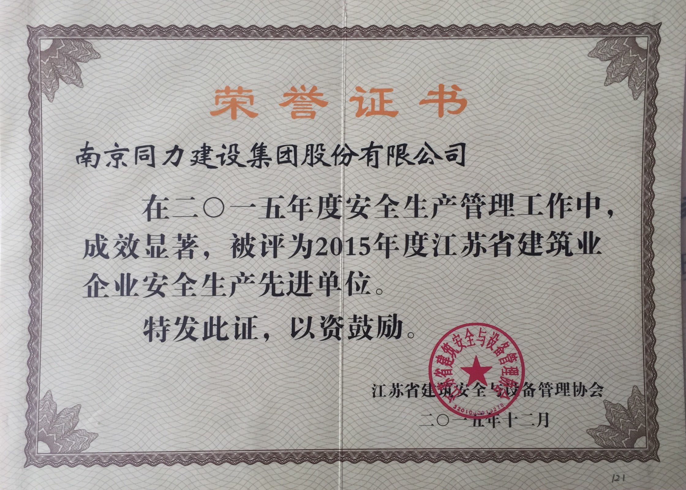 公司被評為2015年度江蘇省建筑業(yè)企業(yè)安...