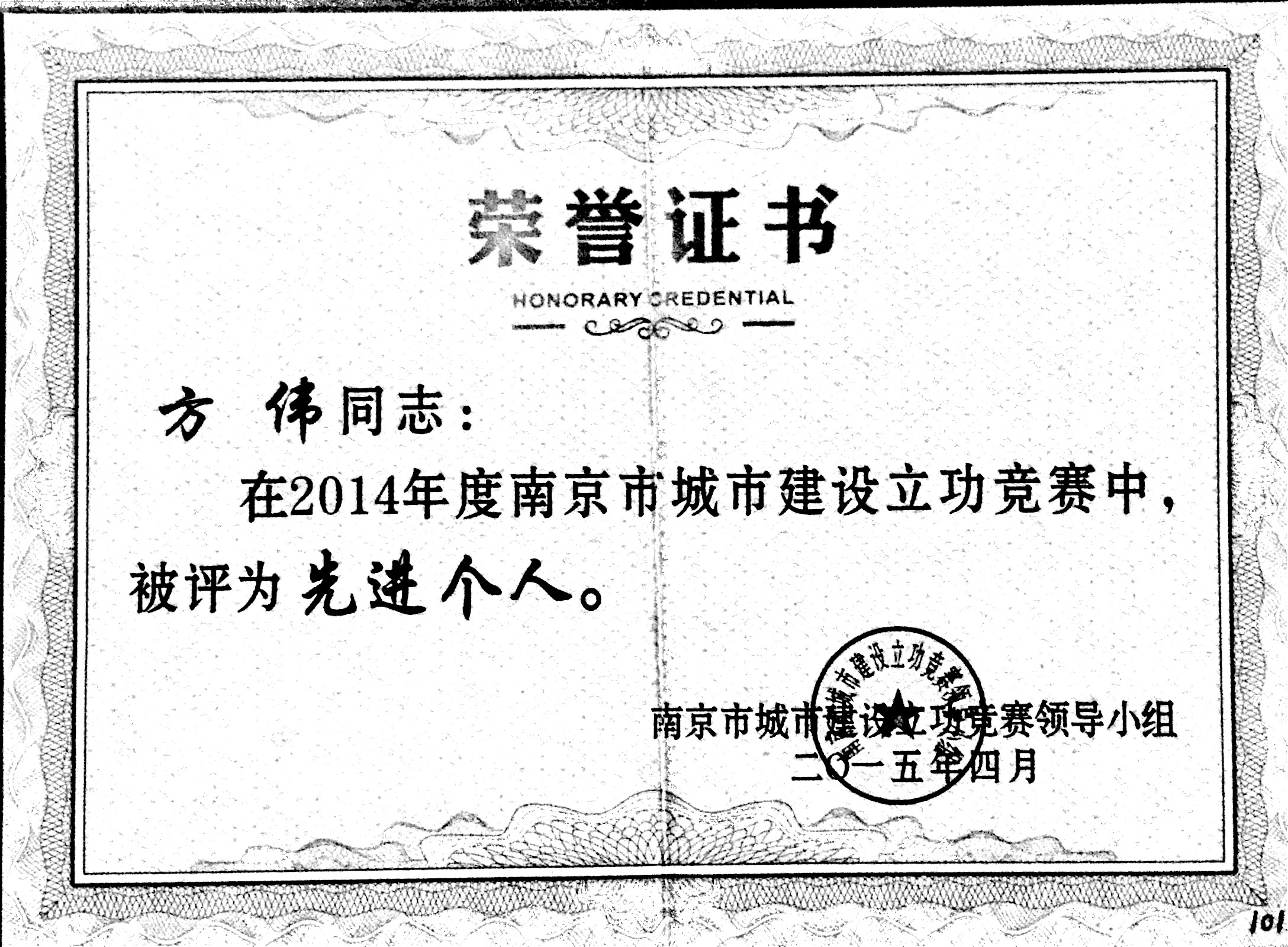 公司方偉在2014年度南京市城市建設立功...