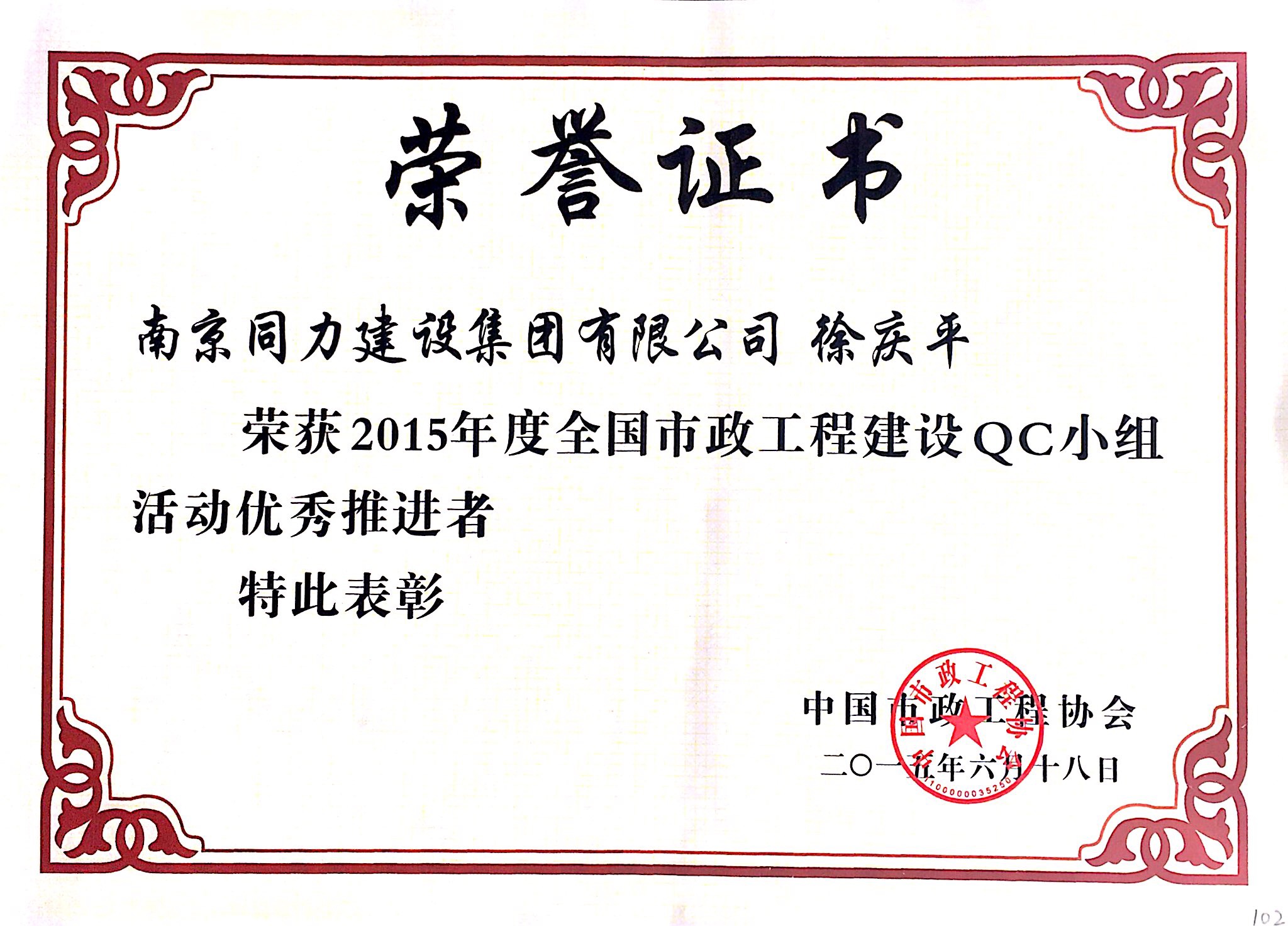 公司徐慶平榮獲2015年度全國市政工程建...