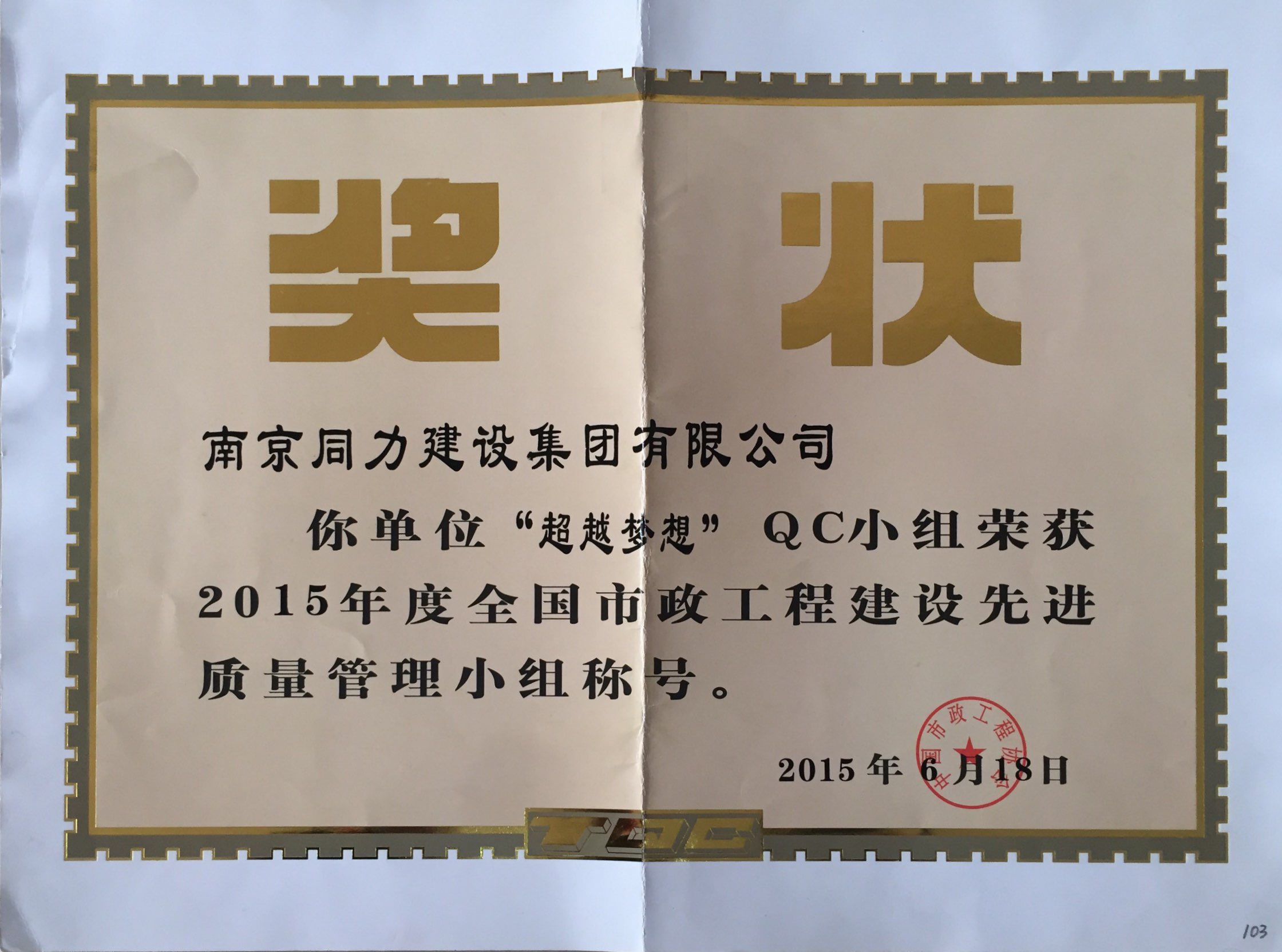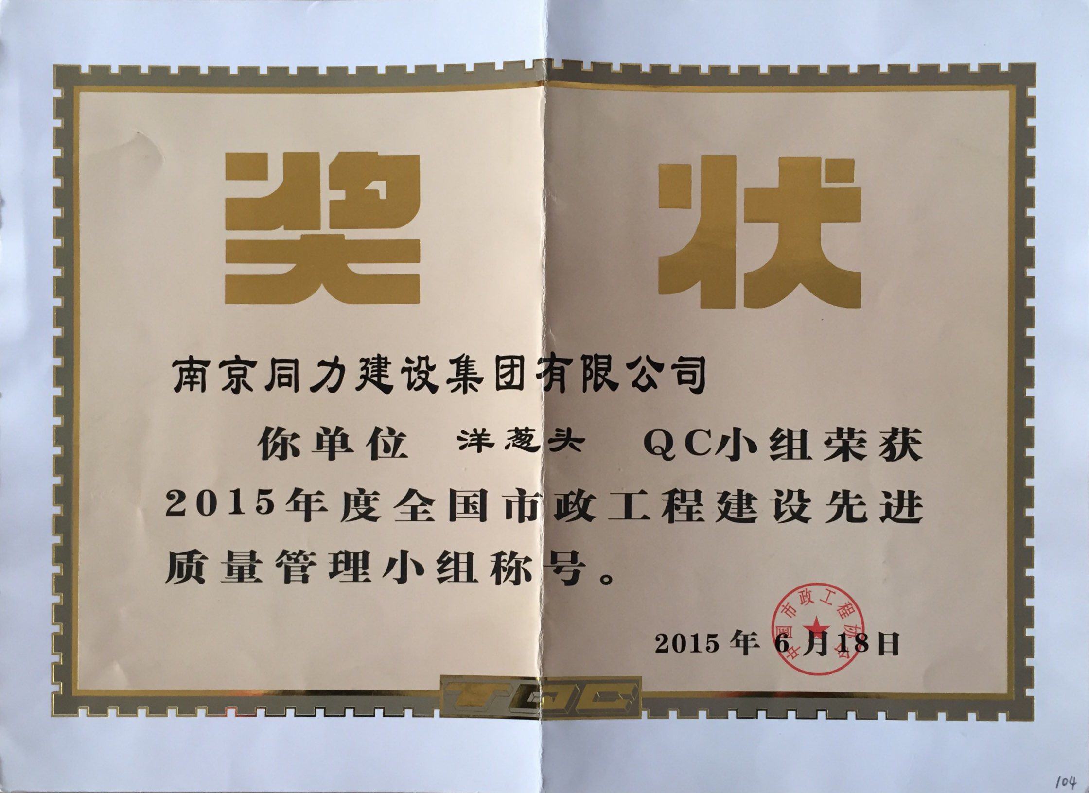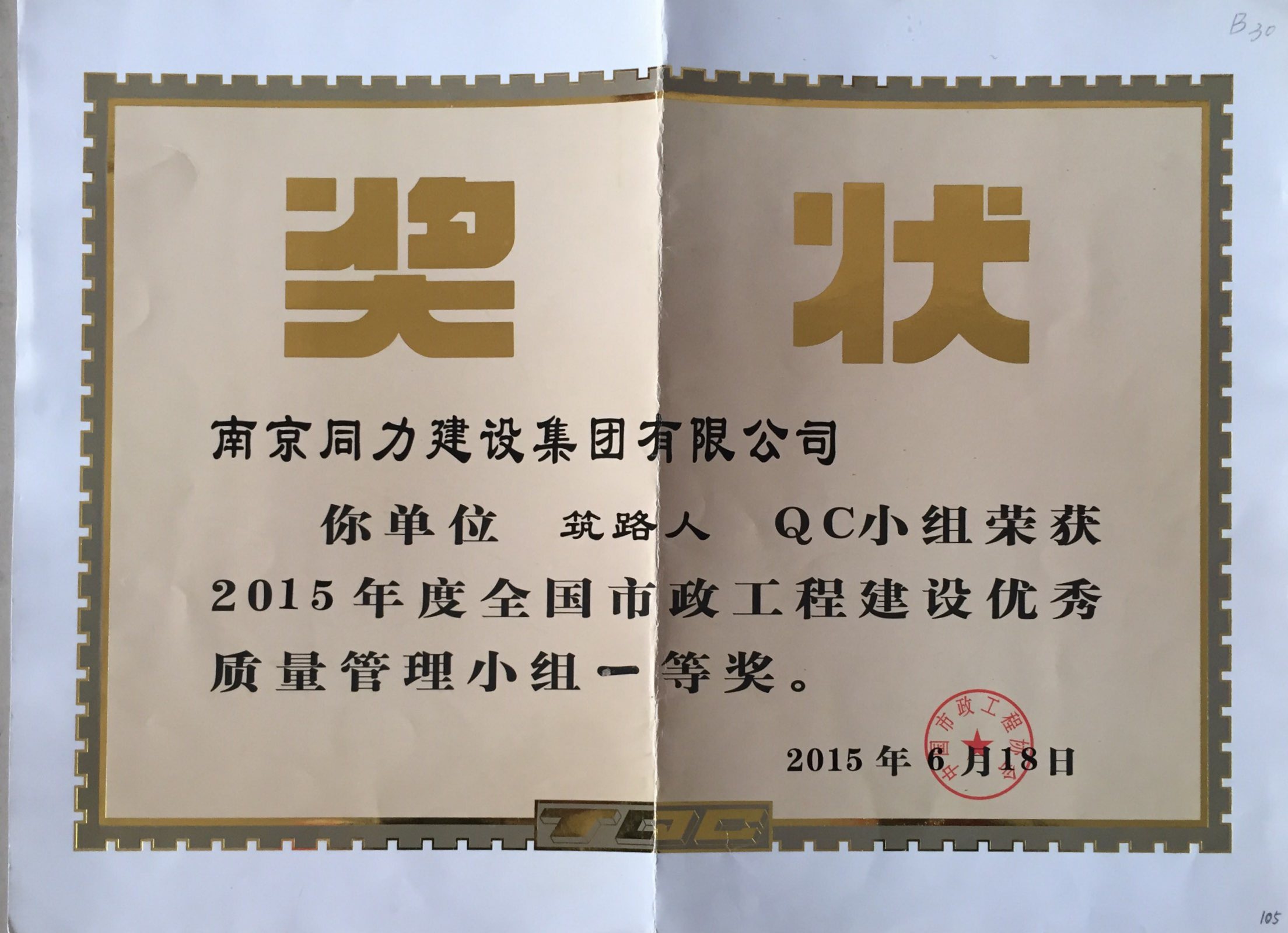 公司“筑路人”QC小組榮獲2015年度全國市...