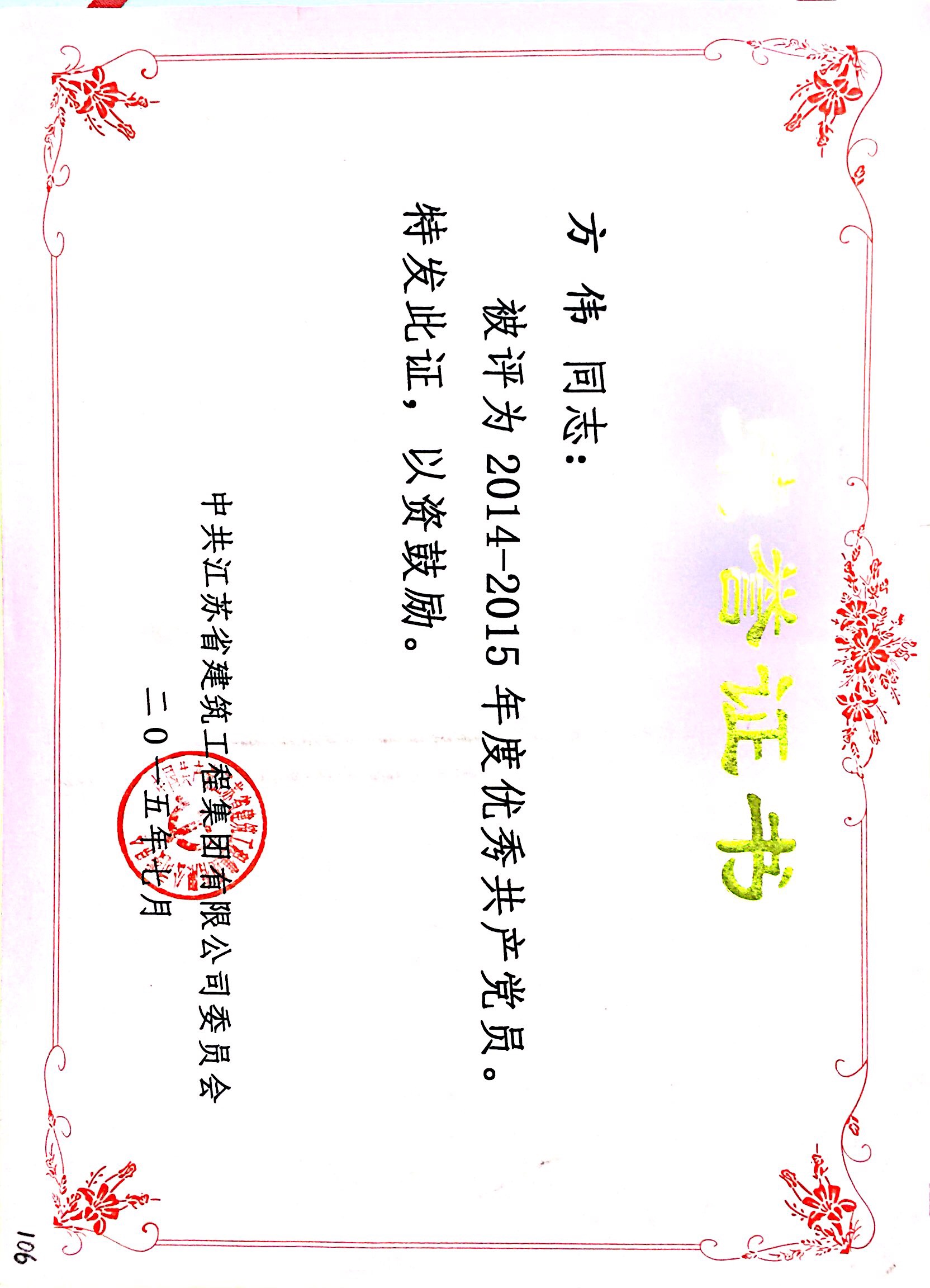公司方偉被評為2014-2015年度優秀共產...