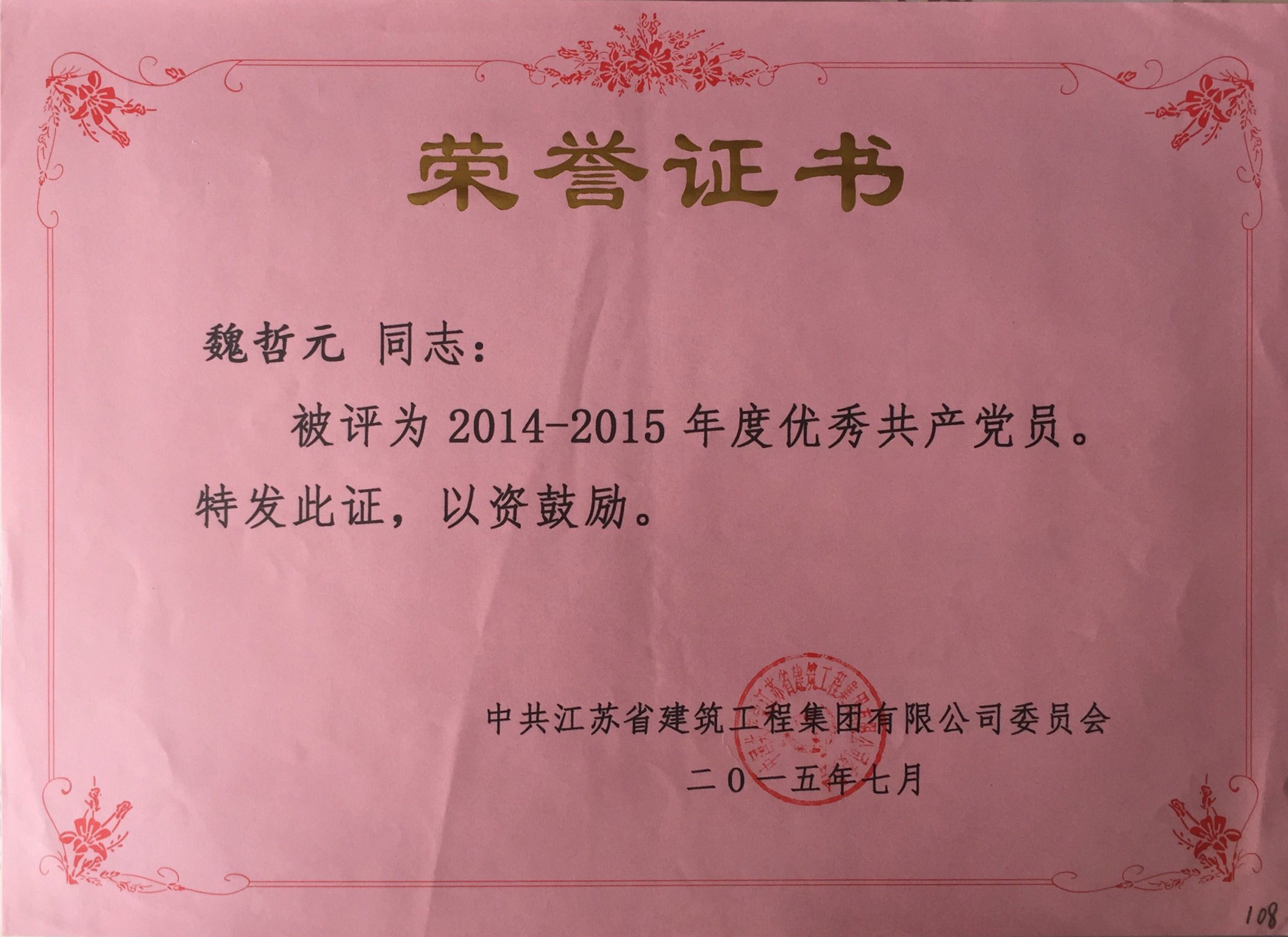 公司魏哲元被評為2014-2015年度優秀共...