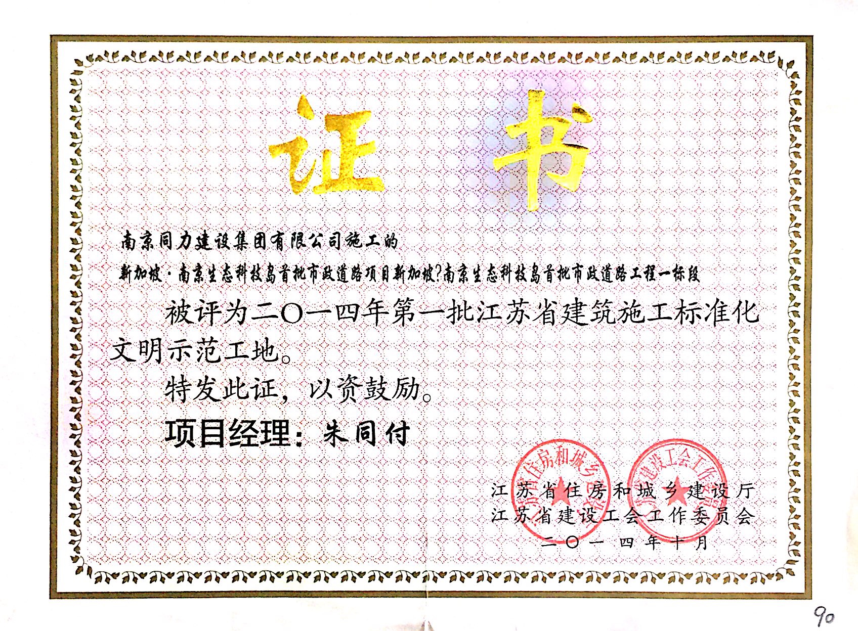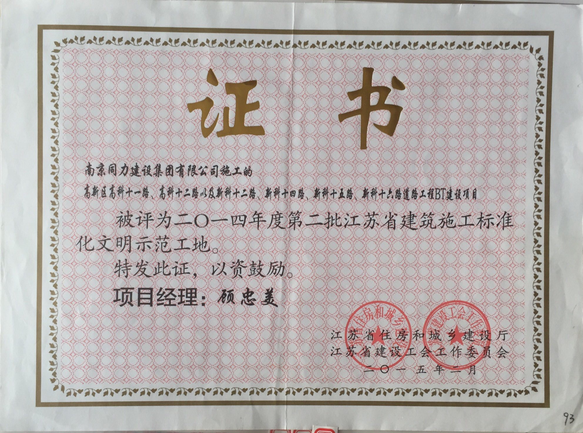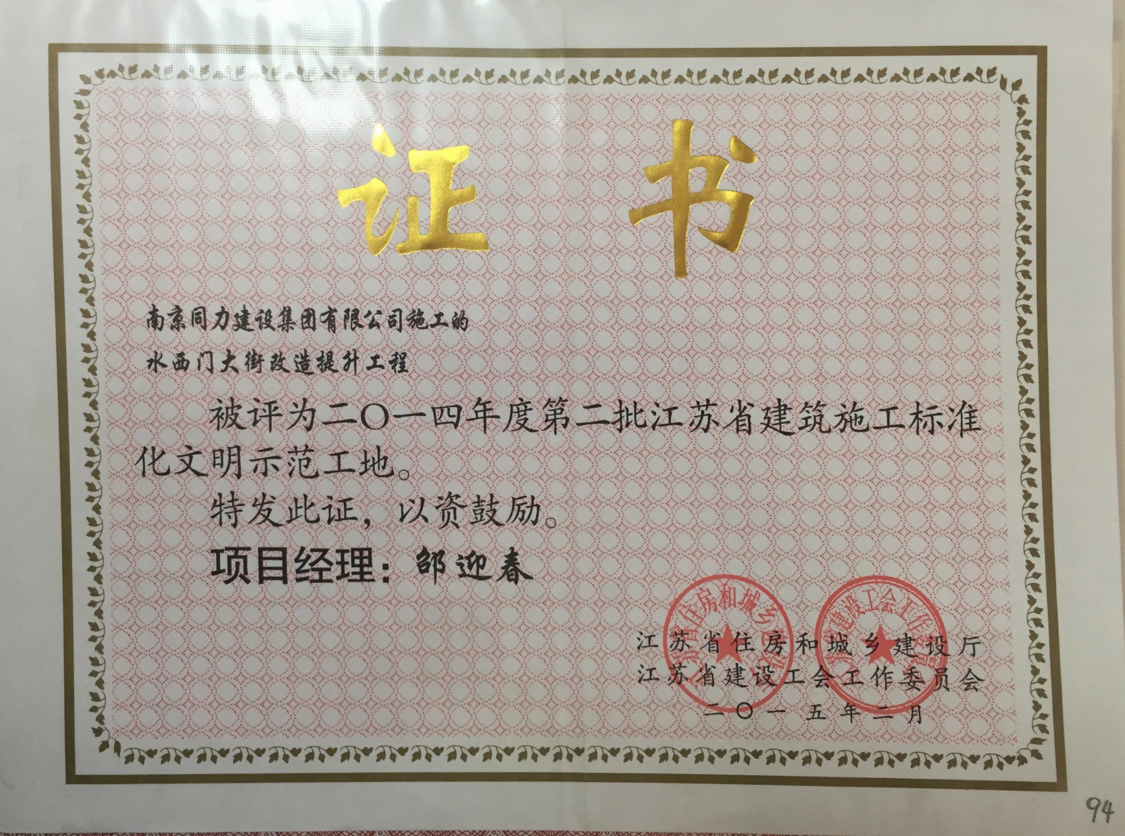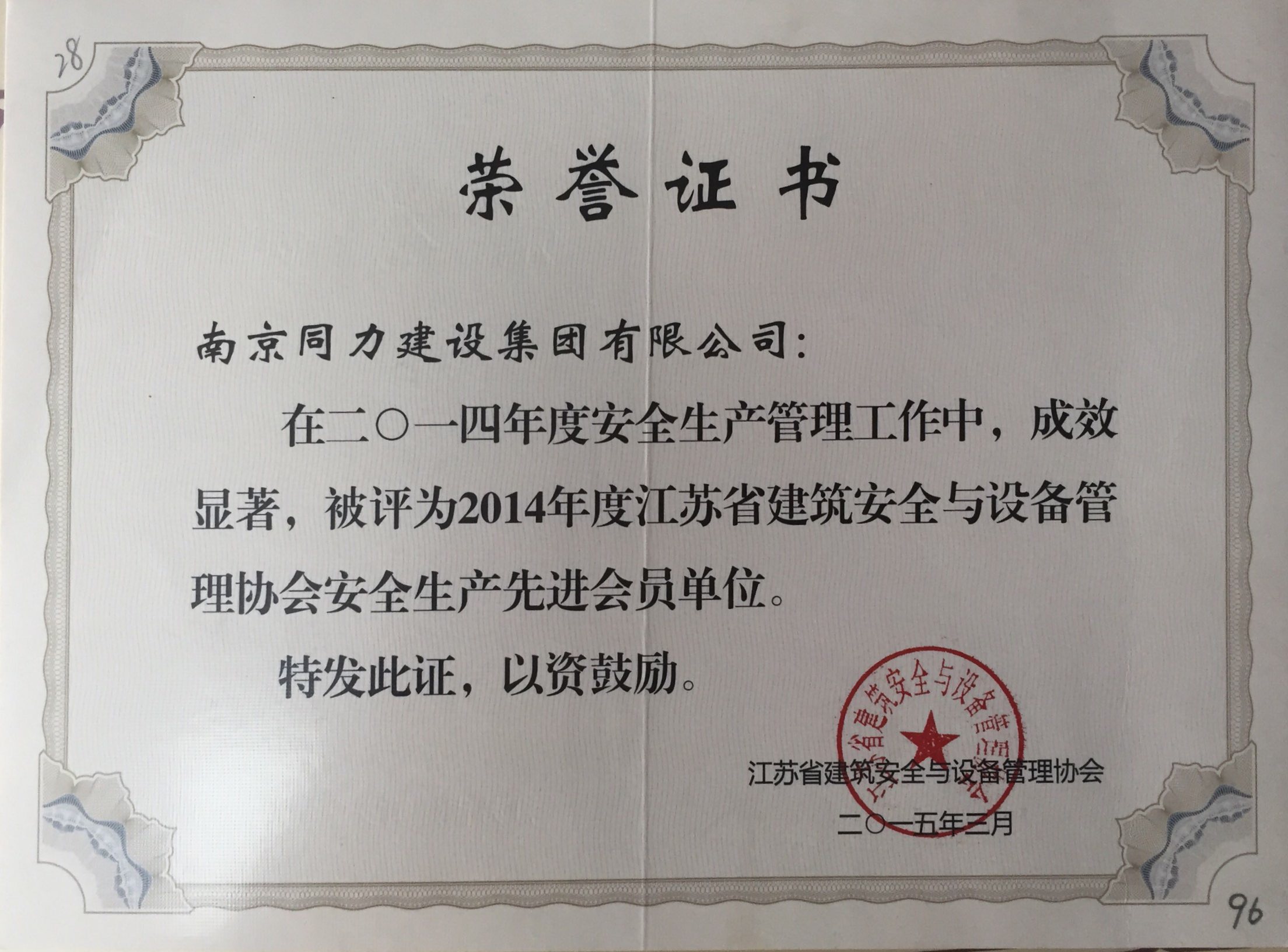 公司榮獲2014年度江蘇省建筑安全與設備...