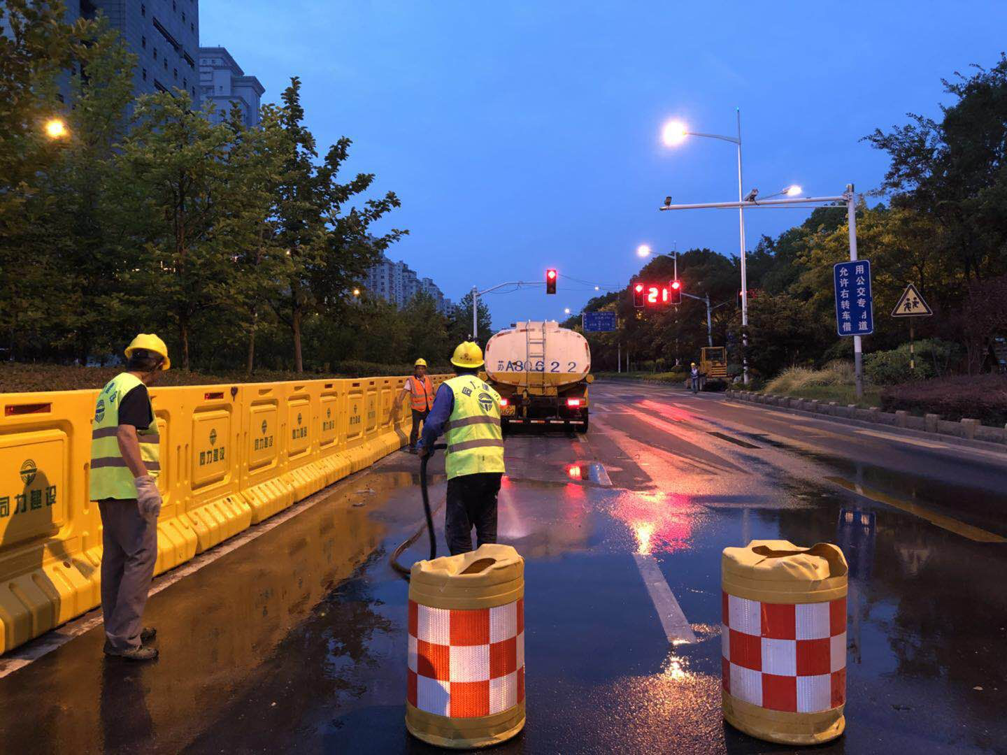 龍蟠中路整治中最大難點在于承載交通壓力大,施工時間受很大約束。首先是每日的工作時間較短,雖前期做了大量溝通工作,但鑒于龍蟠中路是城市南北向交通大動脈,施工容易造成嚴重擁堵。故最終只能在每日夜間21:00至次日凌晨6:00于進行施工,其余時段均需保證全時段無占用通行。在復雜不利的環境下,緊抓“定時清場法”、施“單元施工法”不放松,將整條道大路劃分為十六個單元以便組織推業進。每日夜間21:00圍擋設施、施工車輛等陸續進場,大批施工人員和交通疏導人員在各個單元就位,然后根據現場車流量情況試用圍擋封閉部分車道,并根據測試圍擋后車流通行效果靈活調整車道封閉時間以及車道封閉數量,在確認不會造成交通堵塞之后再圍擋施工。見縫插針、統籌協調、調整工設序,努力做到化難點為亮點。為了確保白天可以順利開放交通,提前擬定方案,將小面積難以壓實、大面積難以養生的水泥穩定碎石道路基層處理方案,調整為小面積用砼澆筑覆蓋鋼板養護、大面積病害采用ATB瀝青碎石即壓即成型的方案,既保障了交通也保證了質量。同時部署各單元作業班組集中力量在少量點位內施工,開一段干一段收一段,不多開作業面,便于控制質量和進度,同時方便組織圍擋、開放交通及白天的維護巡查;對于過路溝槽、病害處理的鋼板覆蓋措施,也有多項要求及改進。首先是確保鋼板厚度不低于2厘米,并在鋼板下放置橡膠墊,減少車輛碾壓的噪音,鋼板四周還會設置減速帶起到警示過往車輛減速以及避免鋼板發生位移,其次是對于鋼板下脫全跨度大于1米的增設槽鋼支撐,并做到24小時人員巡視不間斷。與此同時,周邊一些單位比較支持,騰出了一些空地給我們堆放材料,這樣在每天早上6點能確保圍擋和施工車輛等就近安放,恢復快車道交通。
